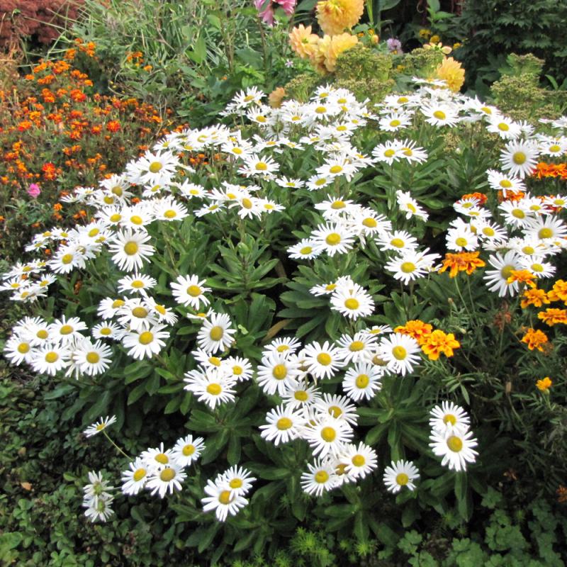 An outstanding shrubby perennial, producing large white daisy blooms with greenish-gold center disks, rising on long stalks; a beautiful addition to the garden when massed; after blooming in mid-summer, cut back for a great fall display