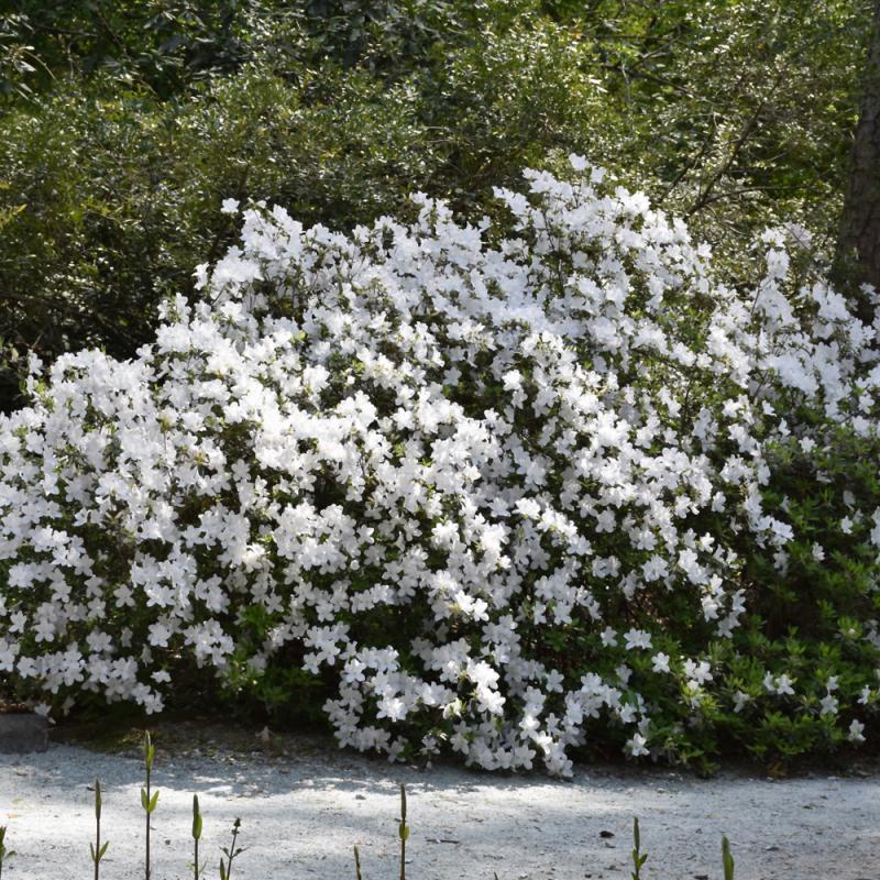 Dense clusters of snow white blooms, some semi or double, cover this azalea in mid to late spring; a compact rounded shrub with attractive leaves that progress to yellow in the fall; needs highly acidic and organic soil that is well drained