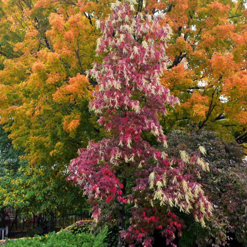 An uncommon yet very ornamental small accent tree with something for all seasons; drooping panicles of urn-shaped flowers in late spring followed by similar seeds, brilliant red fall color and a distinctive habit; needs very specific growing conditions
