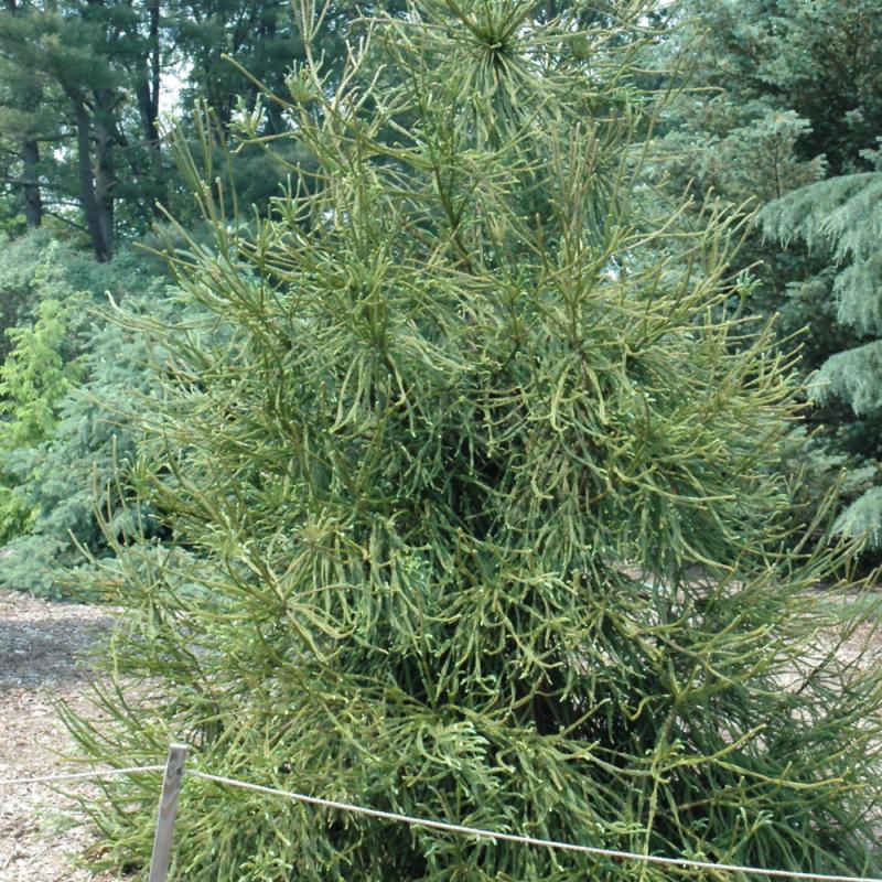 A graceful conical shrub in the Cypress family, with stunning foliage that emerges white and slowly ages to a gray-green; a perfect garden or landscape accent shrub that is sure to draw attention; displays some bronzing in winter