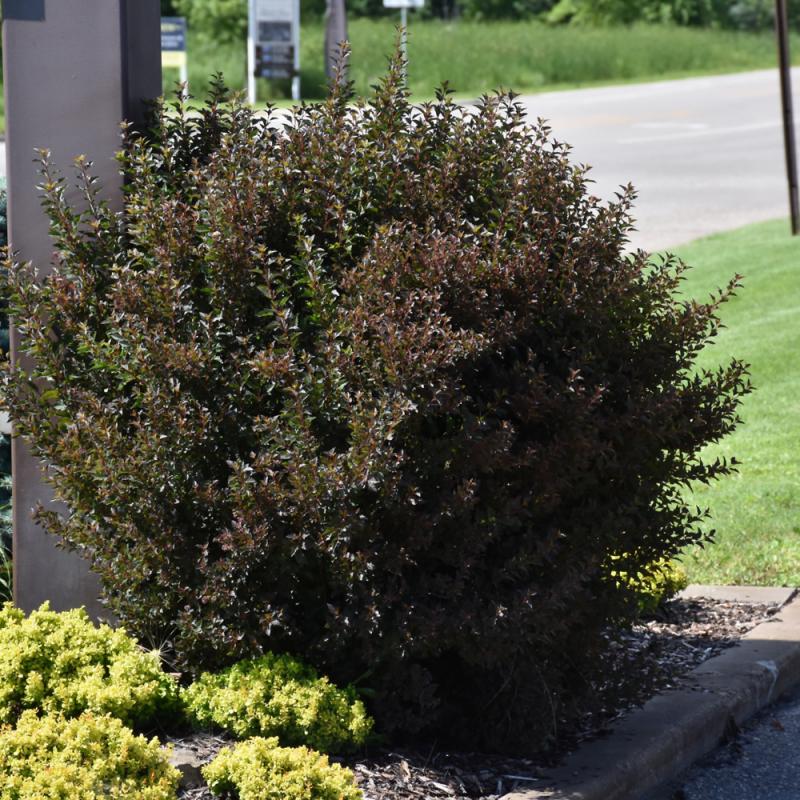 A compact upright shrub with burgundy leaves; features small pinkish-white spirea-like flowers followed by subtle reddish fruit, and interesting peeling papery bark; extremely tough and durable, good for massing or general garden use