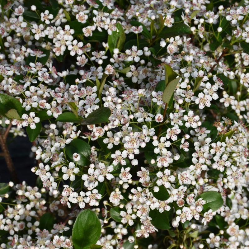 A compact, mounded variety with glossy dark green leaves, and a flurry of showy white flowers in spring; a great choice to compliment other perennials and annuals in summer; brilliant red foliage in fall to contrast the dark blue fruit; very adaptable