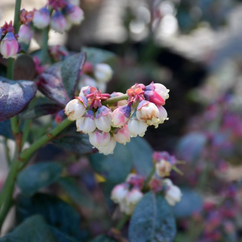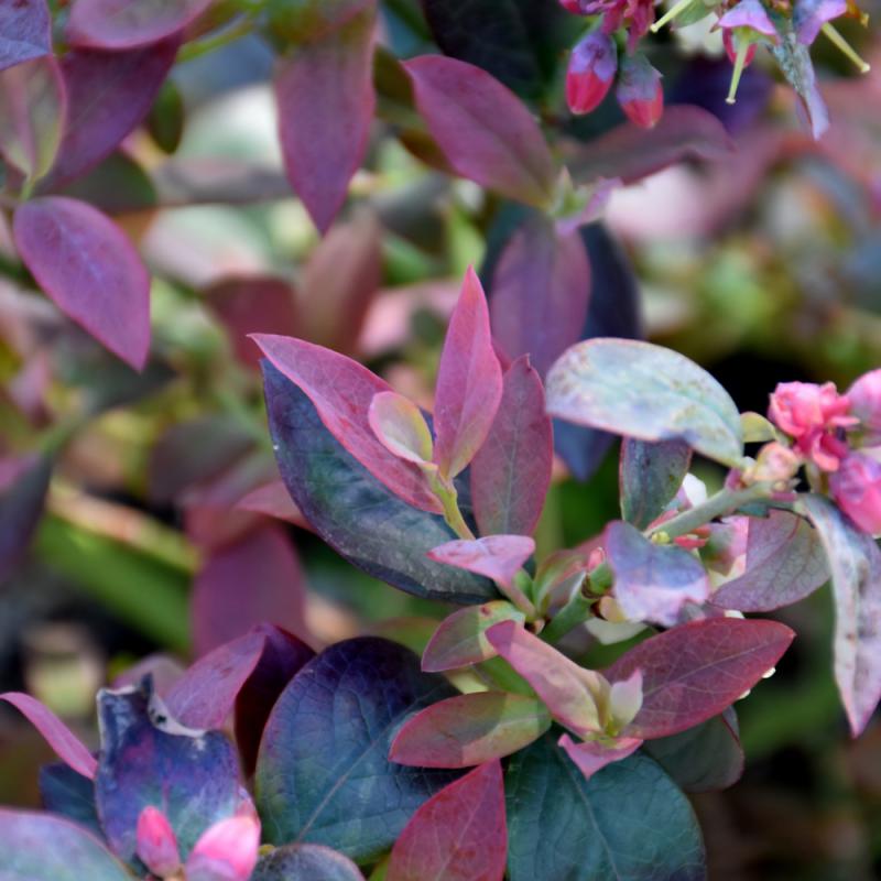 A stunning variety with beautiful spring foliage; hues of pink and blue-green, turning turquoise in fall; produces large, sweet blue fruit in mid summer; blueberries require highly acidic soils, excellent drainage and a good mulch, plant with peat moss