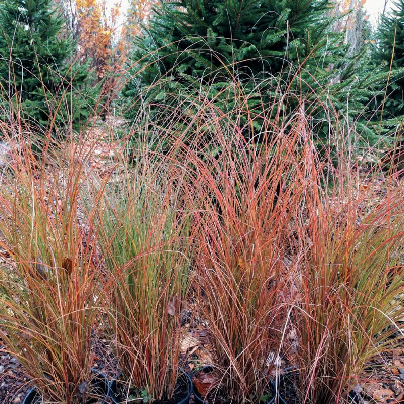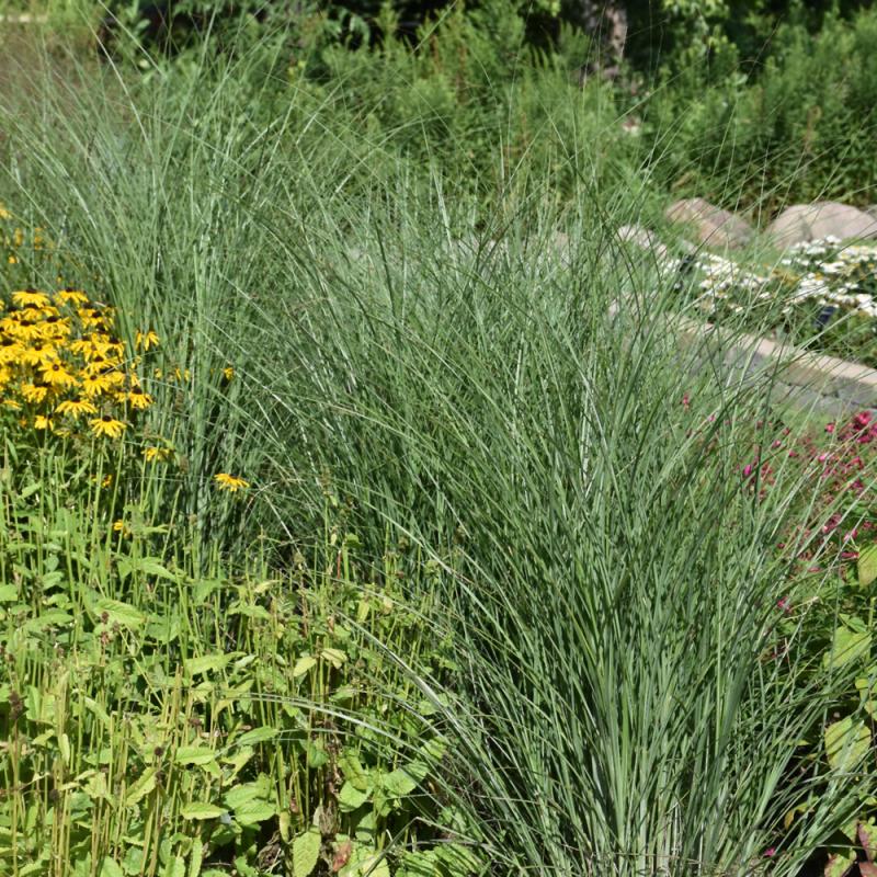 This non-invasive, infertile variety produces a large, elegant arching mound of green blades with white midribs; a striking cascade of soft pink plumes rise above the foliage in fall and mature to silvery-beige; provides great fall color