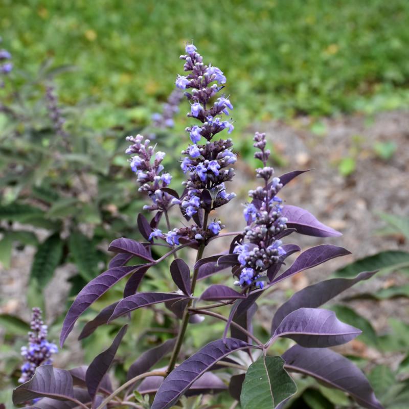 A compact hybrid selection with airy spikes of reblooming purple flowers throughout summer; distinctive olive green palmate leaves have dusky purple undersides; likes full sun and is very easy to grow; may be shaped into a small tree