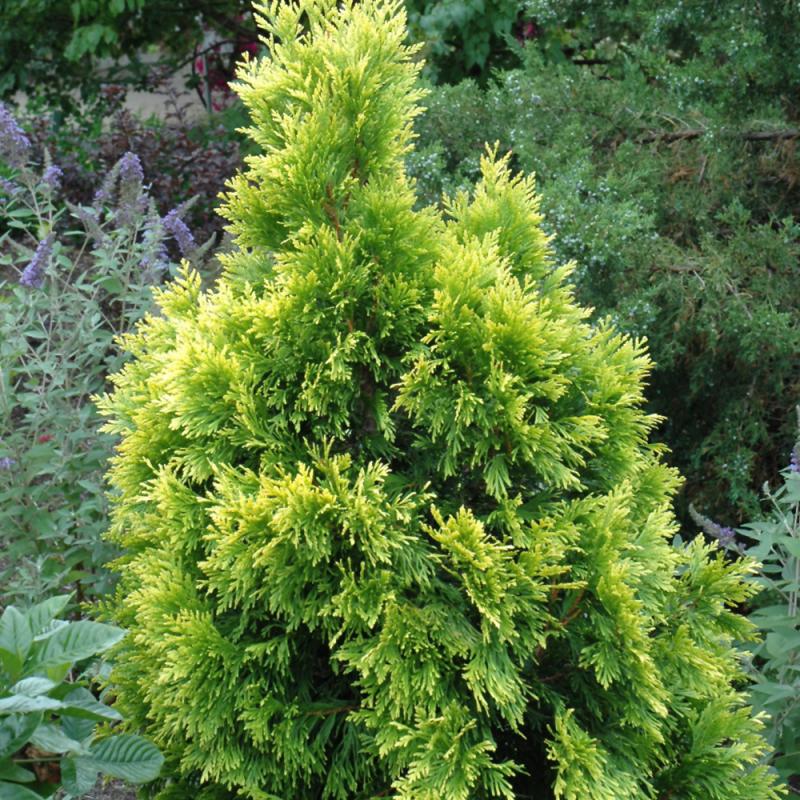 A stunning accent tree which features rich golden sprays of foliage generously flecked with yellow and a narrow upright pyramidal habit; an excellent choice for color accent or articulation, performs best in moist, humid locations, but is adaptable