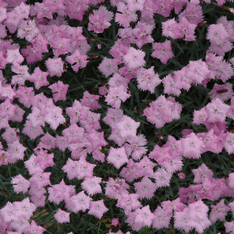 Vigorous and free flowering, this selection features lovely frilly pink flowers, spreading across a low growing mat of gray-green foliage; easy to grow, tolerating some heat and humidity, perfect for rock gardens, borders, beds or containers