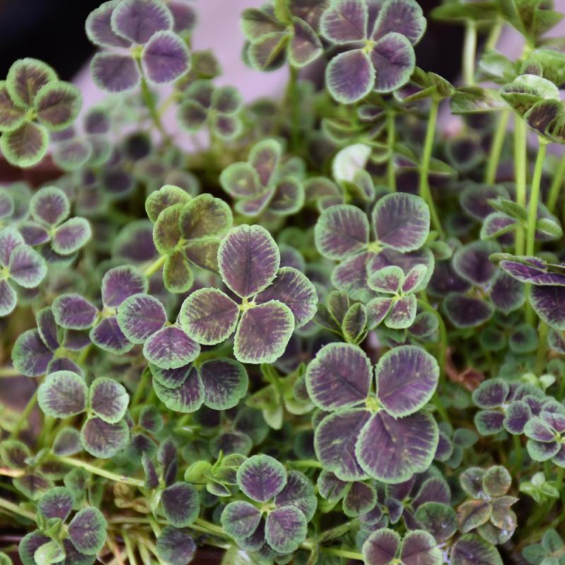 A showy form of clover with attractive dark purple-black leaves that are edged in sea-green; the roots of this plant fix nitrogen in the soil; potentially invasive, rooting at the nodes; use where it can roam freely as groundcover, with shrubs or bulbs