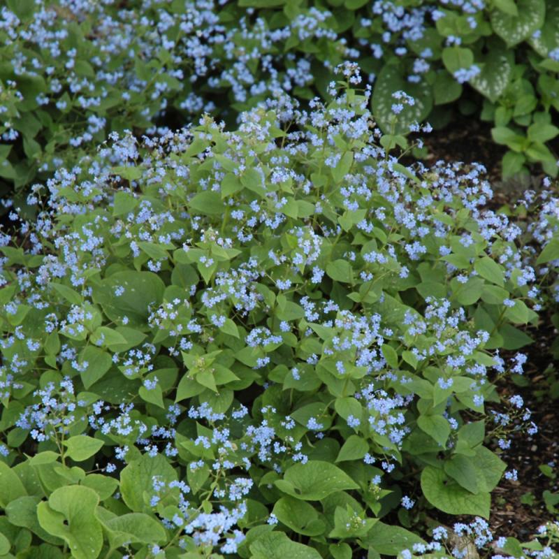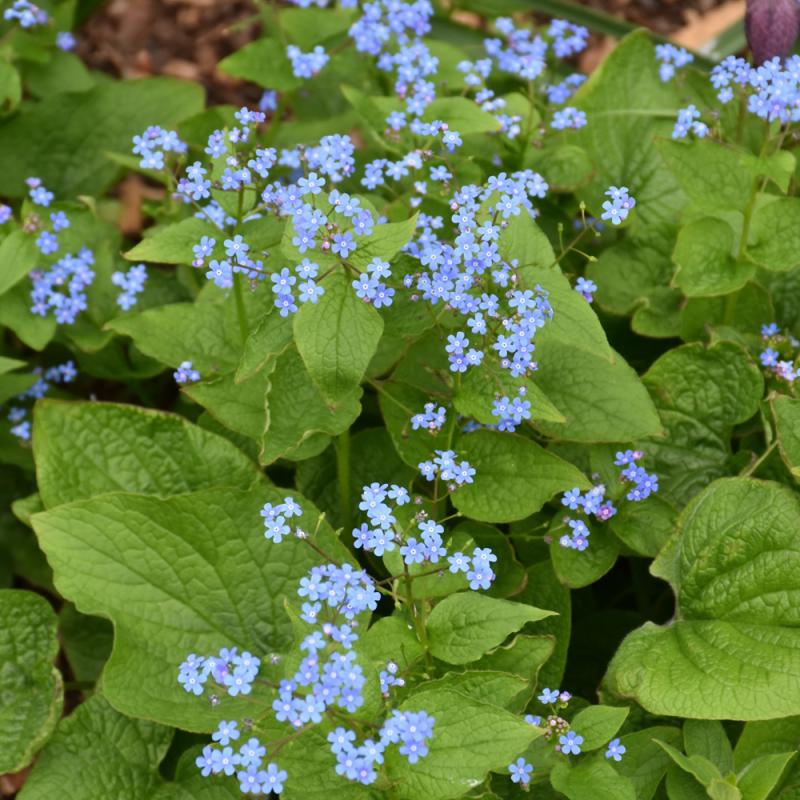 Mounds of lawn green, heart shaped leaves are featured in this shade loving selection; easy to grow, requiring little to no maintenance; sprays of small, sky blue flowers emerge during the late spring months-can be cut and added to bouquets