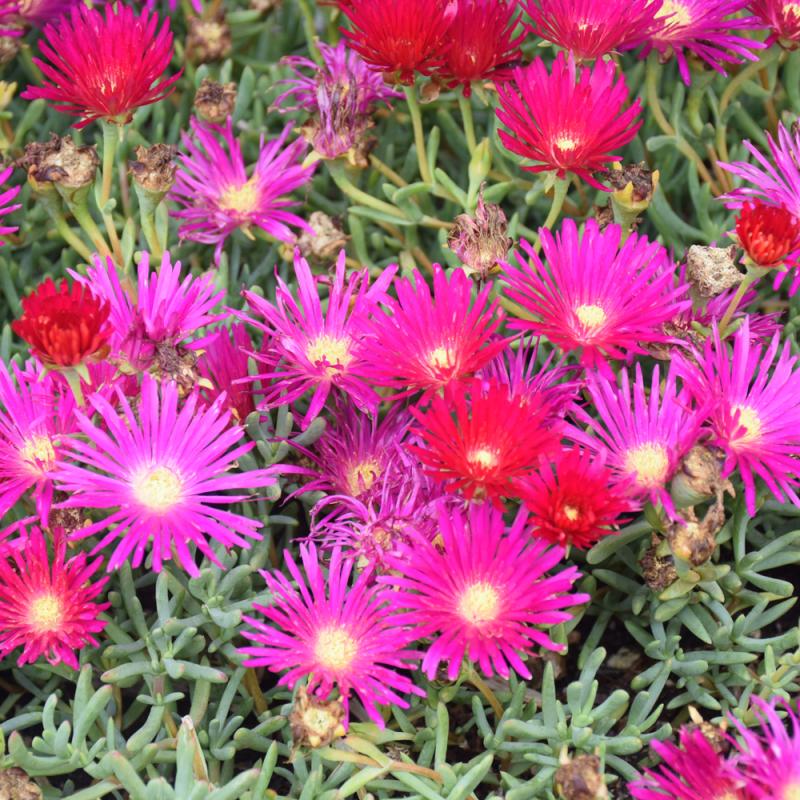 Low growing carpet-like, succulent, native to South Africa but amazingly hardy in North America; bright purple daisy-like flowers cover the ground; green foliage has burgundy overtones in fall; perfect for xeriscapes, rock gardens, screes and sandy soils
