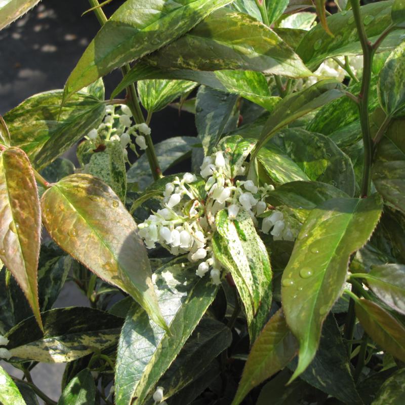 A striking hybrid variety with multicolored new foliage that becomes dark green and cream; this lovely colonizing shrub blooms prolificly in spring with long racemes of white bell flowers; makes a handsome tall groundcover