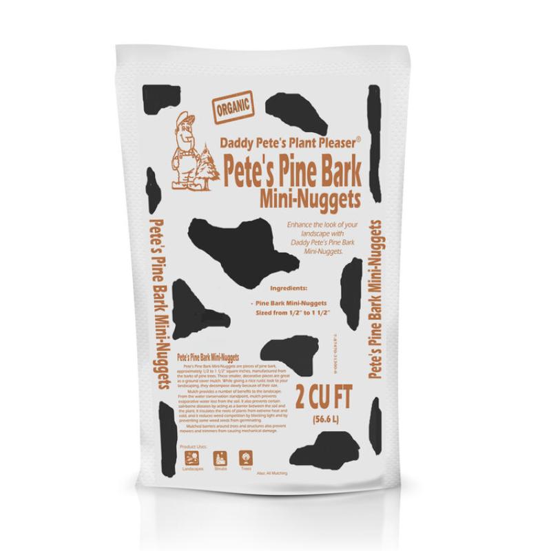 Daddy Pete’s Pine Bark Mini-Nuggets are pieces of pine bark, approximately 1-2 1/2 square inches, manufactured from the barks of pine trees. These smaller, decorative pieces are great as a ground cover. While giving a nice rustic look to your landscape, they decompose slowly because of their size.