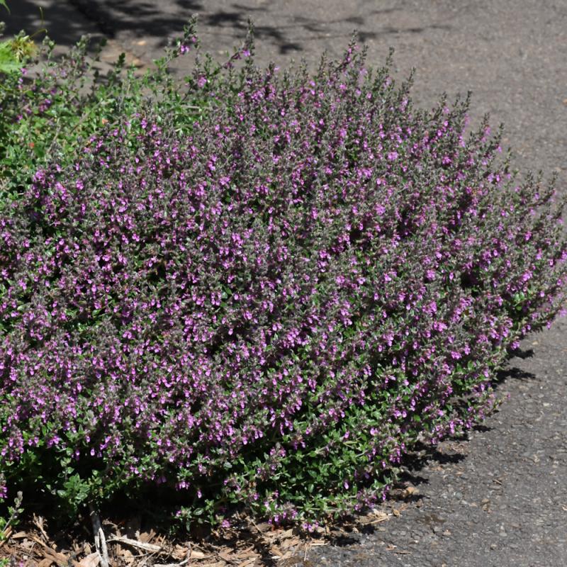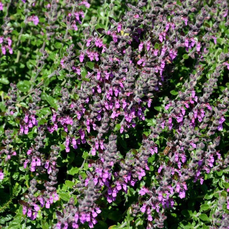 Creeping Germander features delicate spikes of purple flowers rising above the foliage from mid to late summer. Its glossy narrow leaves remain green in color throughout the year.