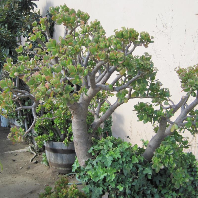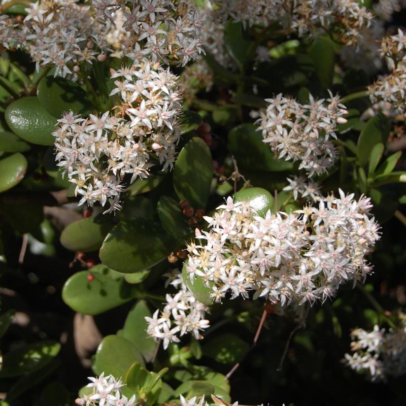An elegantly branched shrub with attractive, rounded succulent foliage; white or pink flower clusters in late winter when exposed to full sun; very slow growing; an excellent choice for containers and rock gardens