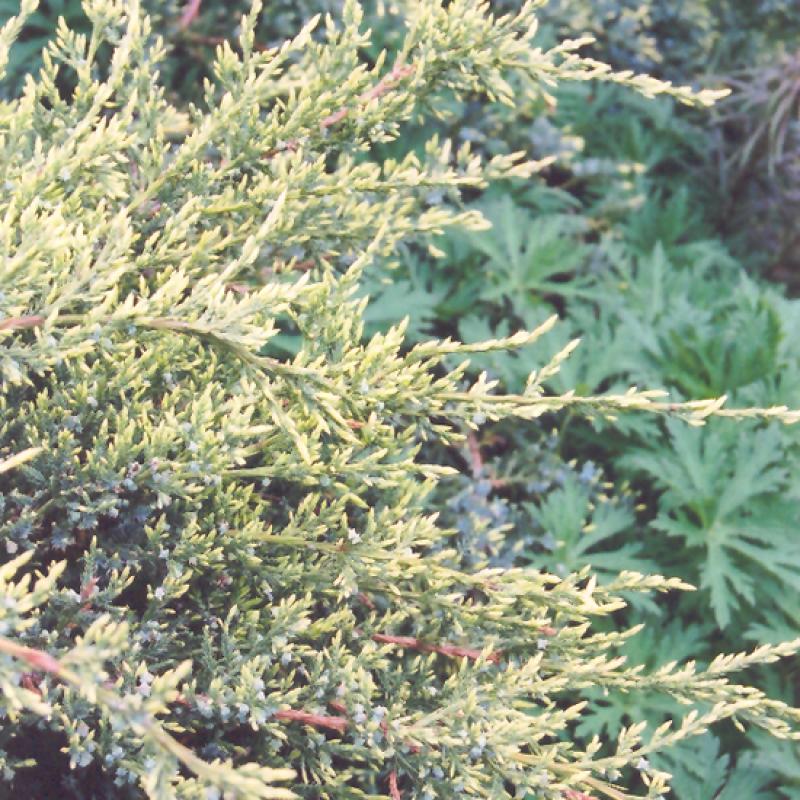 A most beautiful groundcover juniper, featuring bright yellow new growth over bluish-green fine-textured foliage; compact spreading and sprawling, with arching branch tips, superb for massing or as a color accent groundcover