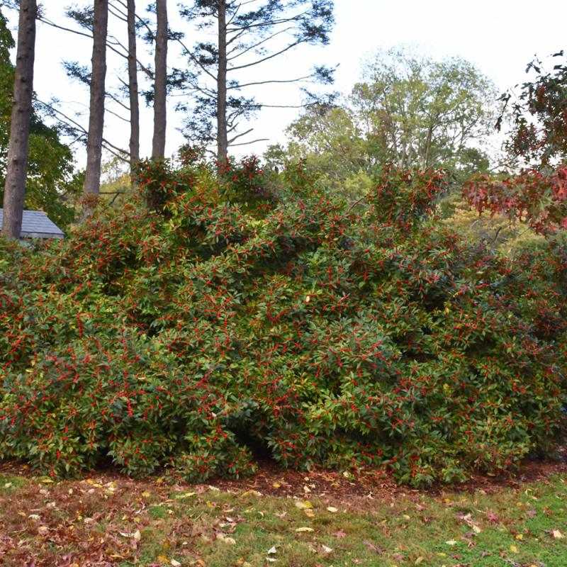 A justifiably popular deciduous holly valued for its abundant and colorful cherry red berries throughout winter, requires a male pollinator; upright growth habit, suckers into colonies; requires moist acidic soils, good for problem areas