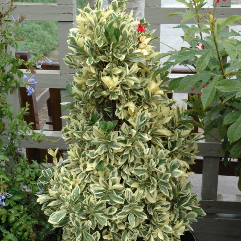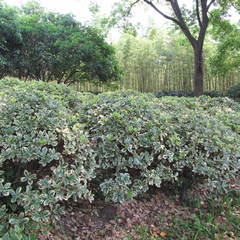 Rich glossy dark-green foliage features bright silver-white variegation; seaside salt tolerance; a great hedge plant with light dense branches that tolerate shearing for a formal appearance, or leave to its natural shape