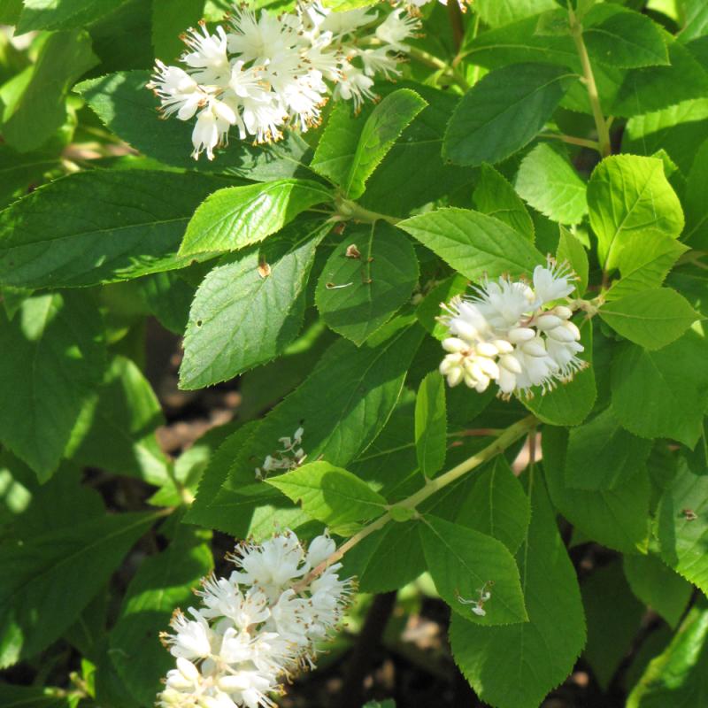 An intensely fragrant shrub with very floriferous spikes of white flowers in late summer when little else is in flower; neat, compact habit of growth and good fall color; needs moist acidic soil; some suckering