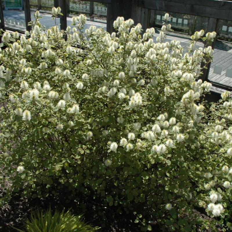 A versatile and trouble-free landscape shrub; features showy white "bottle-brush" flowers in spring on bare branches, blue-green summer foliage, vivid fall colors and an upright mounded habit of growth, prefers light acidic soils; a choice garden plant