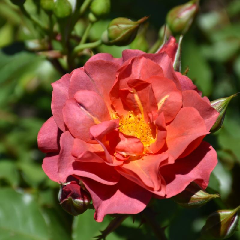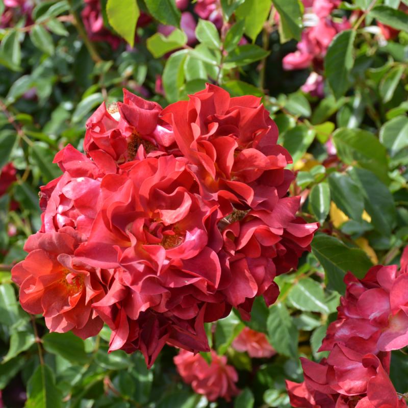Impossible to catagorize, this bright floribunda has giant clusters of blooms containing every shade of red, orange, magenta, purple, and smokey hues; a true festival of color; great for low hedges, large containers, or mass planting