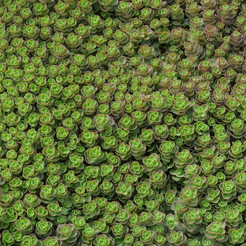 A vigorous perennial groundcover with small succulent foliage which emerges colorful shades of red, eventually fading to dark green; flowers a sea of deep cherry red in summer, spreads rapidly to form a dense low mat; needs a dry and sunny location