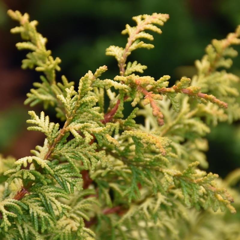 A very slow growing variety with scalloped green and golden foliage with a hint of rust; may reach only 5 feet at maturity with a roughly conical shape; a perfect choice for the residential landscape, the garden as an accent plant, or in containers