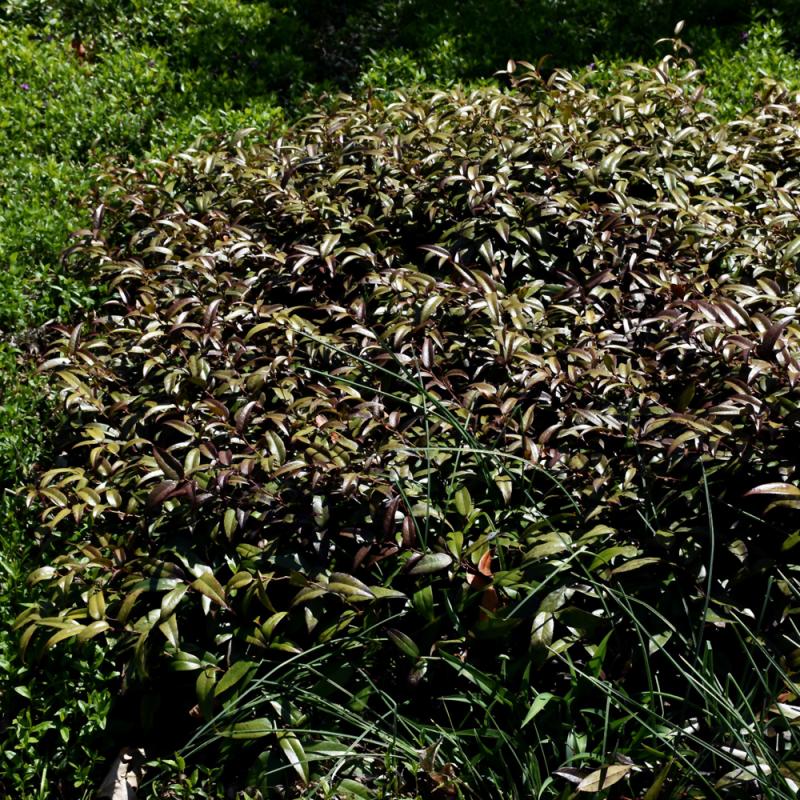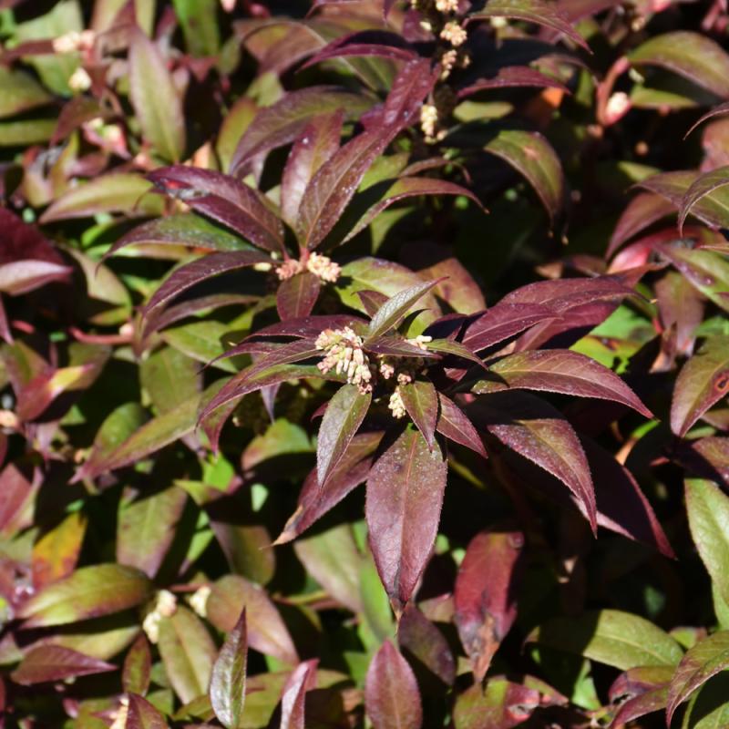 Scarlet-purple new leaves emerge above deep green foliage in spring; this lovely colonizing shrub blooms prolificly with long racemes of white bell flowers; foliage turns reddish-bronze in fall; a compact grower that makes a superb groundcover