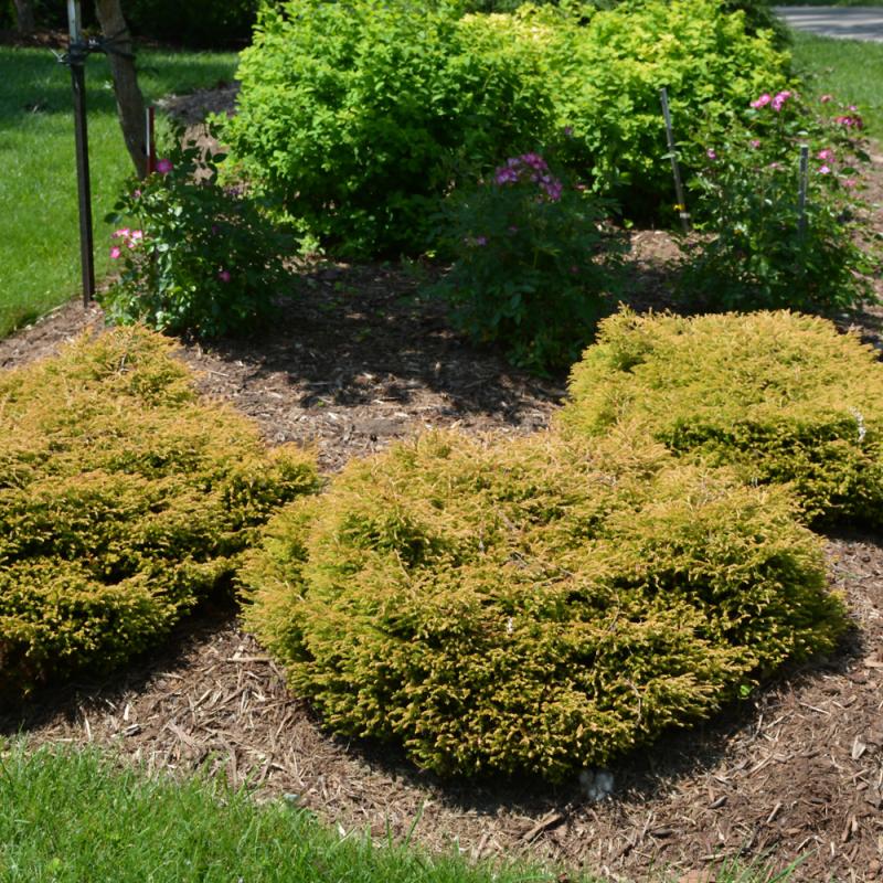 An attractive pillow shaped golden orange shrub that creates an interesting focal point for borders or groupings; very slow growing and full sun brings out its best features