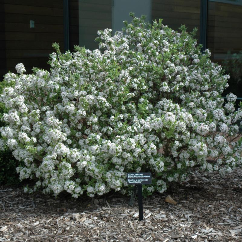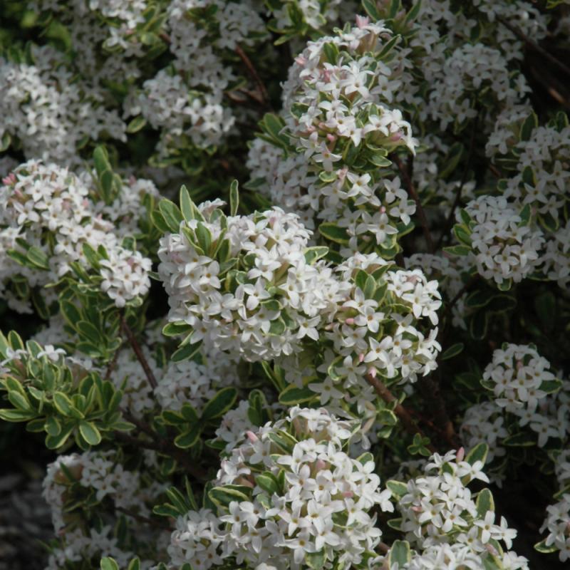 A superb garden shrub featuring extremely fragrant light pink flowers in spring and delicately variegated foliage; the fragrance is intoxicating; very finicky plant, needing light shade and well-drained soil; never move once established