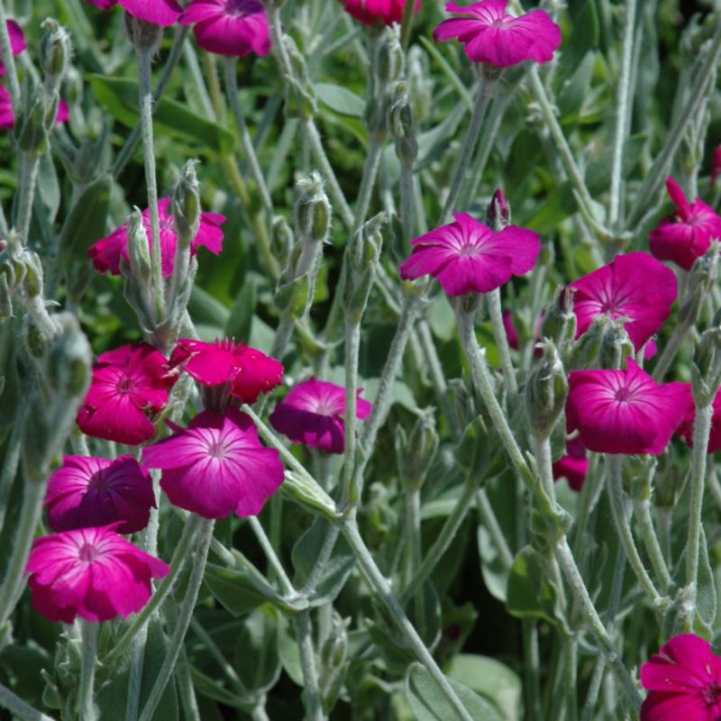 Rose Campion has masses of beautiful fuchsia flowers with white eyes at the ends of the stems from early to mid summer, which are most effective when planted in groupings. The flowers are excellent for cutting. Its attractive tomentose pointy leaves remain gray in color throughout the season. The silver stems can be quite attractive.