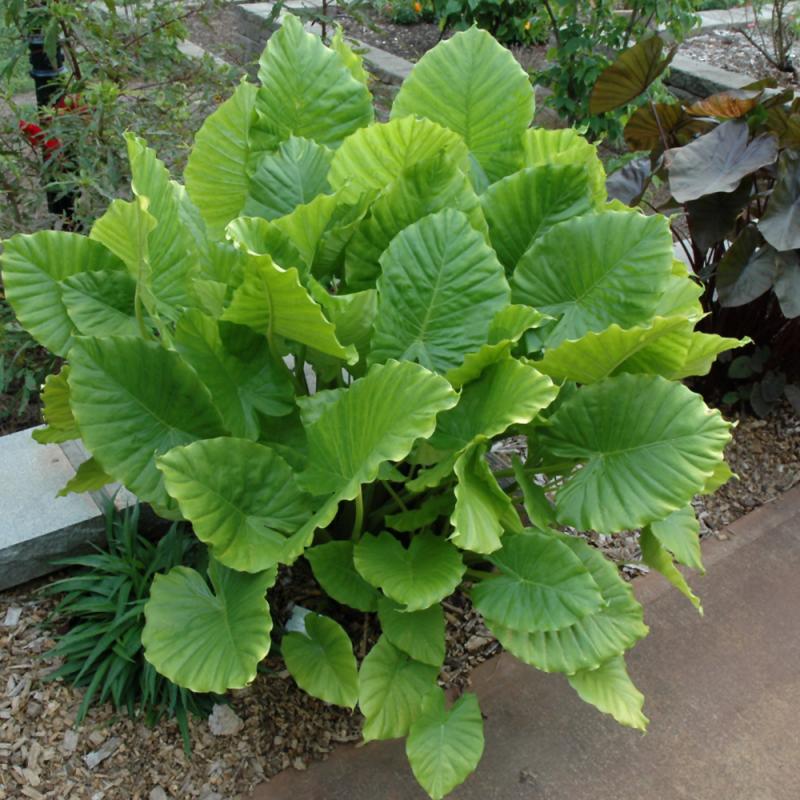 Enormous, scalloped leaves on strong purple stalks, emerge from the center of this fast-growing hybrid, and can reach up to 8 feet; elegant as a large accent or screen; can tolerate some cold and grows well in containers