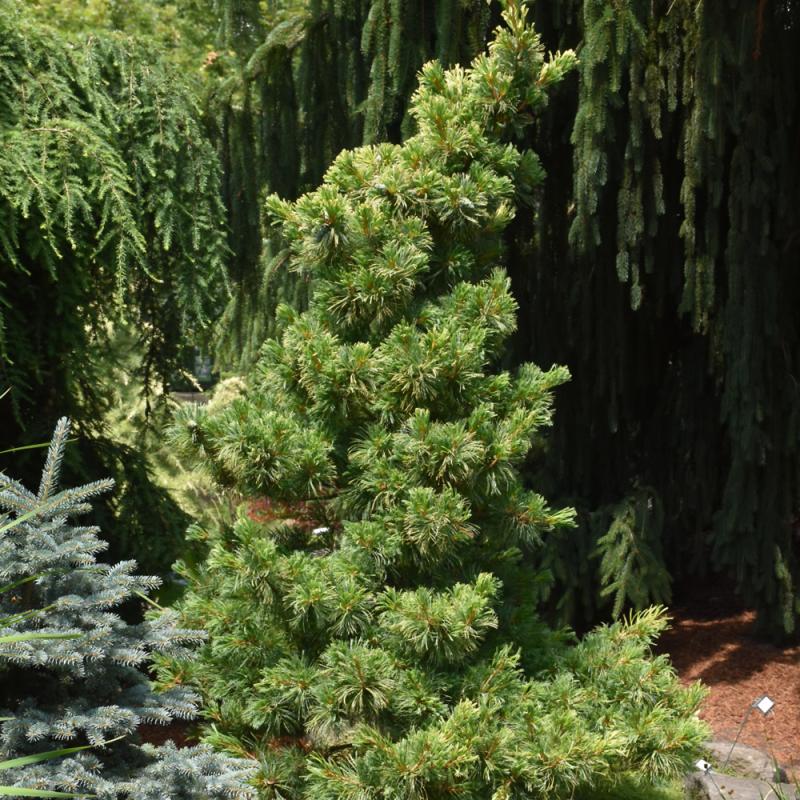 This stunning variety is noted for its long blue green needles which are frosted golden yellow; a naturally artistic sweeping habit makes it perfect as a garden accent; a balance of sun and shade are needed for optimum color