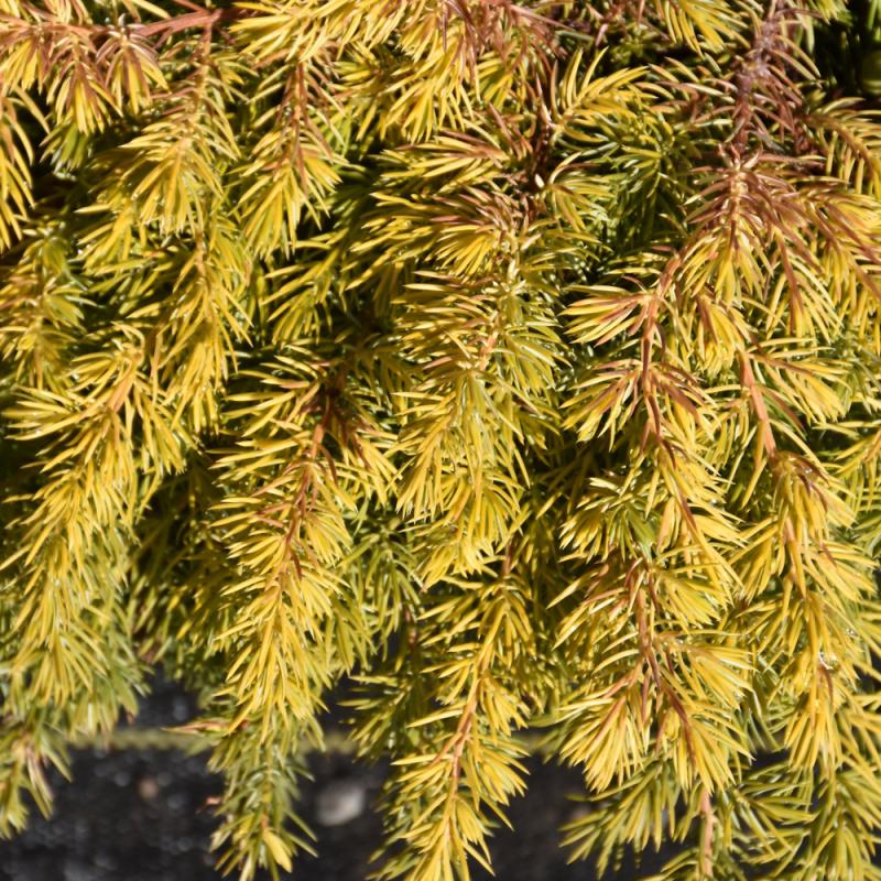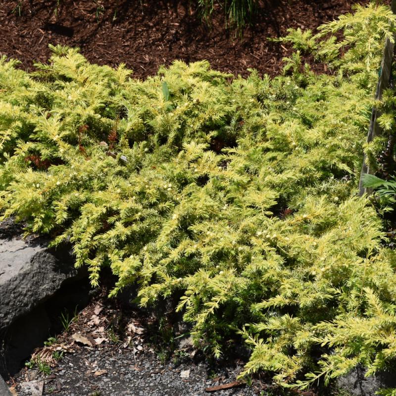 An impressive groundcover juniper with stunning golden foliage and a dense habit of growth; takes on copper tones in late fall and winter; best color in full sun; tolerates salt spray and alkaline soils