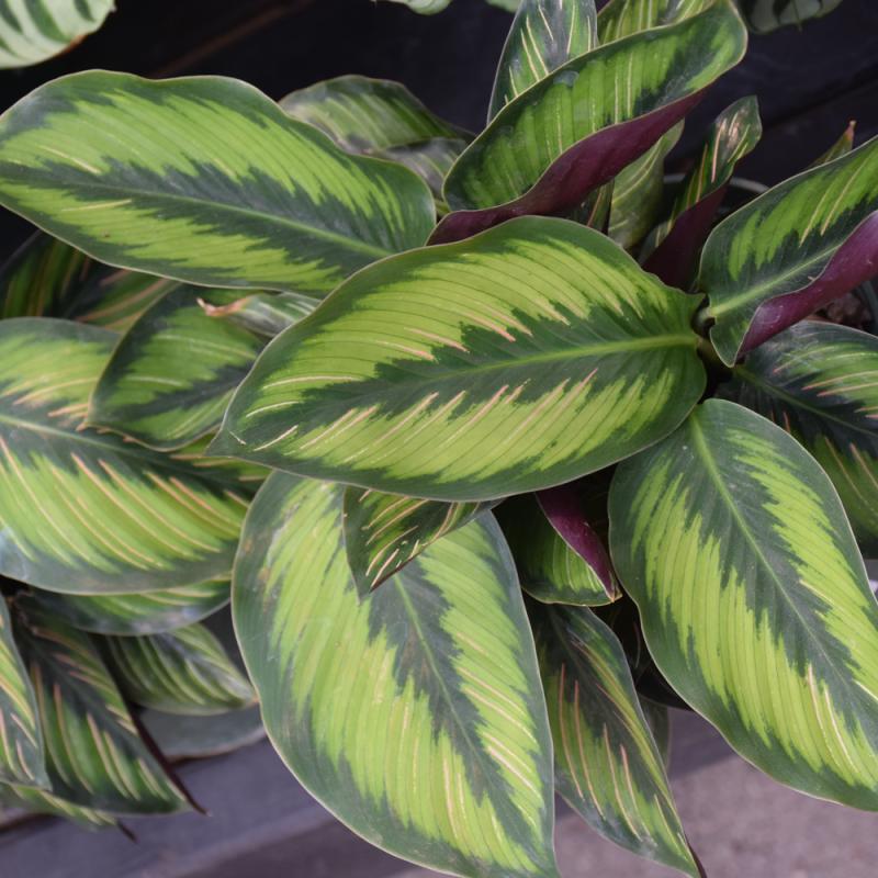 A striking houseplant featuring pointed leaves with colorful, thin pinstriping in green to white tones; thrives in low to medium light; provide consistent moisture and humidity; should not be watered or misted with tap water, distilled or filtered is best