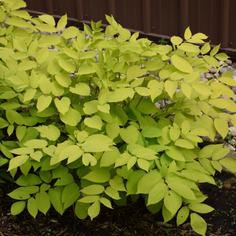 Large golden compound leaves and a rounded, tidy habit makes this a wonderful woodland accent plant; white flower clusters are airy and visually pleasing; foliage is more yellow-gold in bright sun; deep purple-black berries are not edible