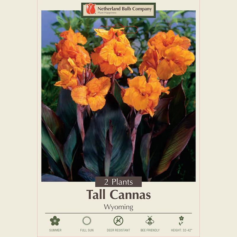 ‘Wyoming’ canna is a tall, dramatic variety with bronze foliage and vivid orange flowers, creating a bold tropical statement in garden beds and water-side plantings.