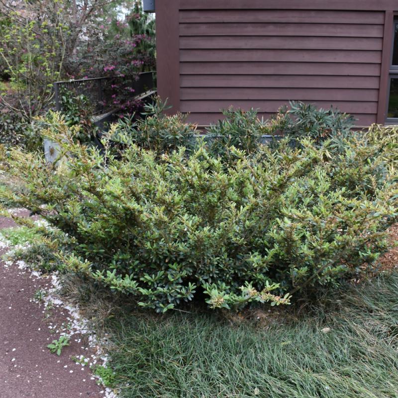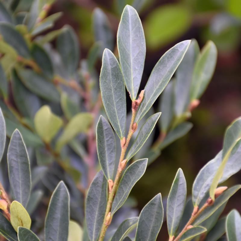 An attractive evergreen plant with emerging light green foliage that matures to a matte finish blue-green; in late winter to early spring, reddish-maroon flowers emerge along the older branches; very elegant when massed together or as an accent shrub
