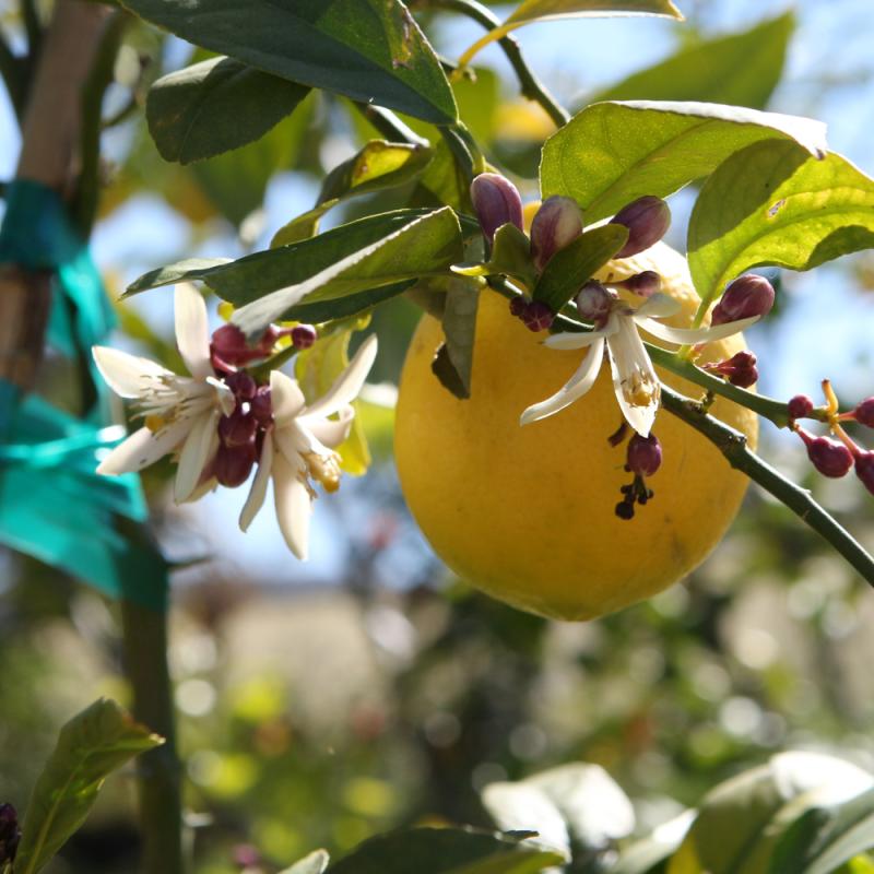 Attractive foliage is displayed on this medium to large shrub, or small tree; fragrant flowers produce juicy lemons year-round; protect from frost; great container plant for the patio or indoors in colder climates
