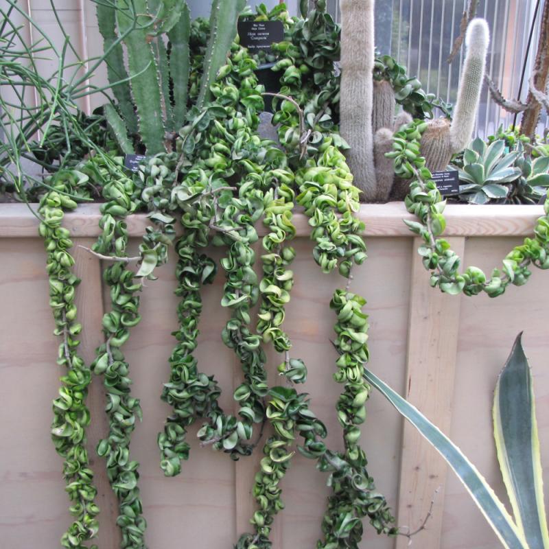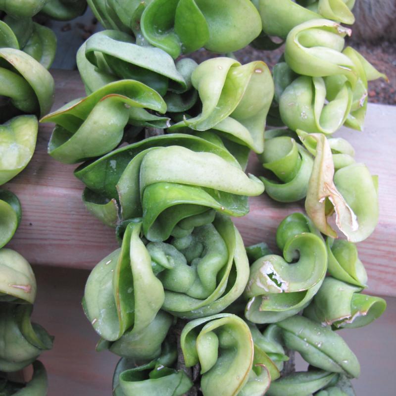 A beautiful succulent vine that is primarily grown as a houseplant; green curly succulent leaves cascade beautifully from indoor hanging baskets and containers; sweet smelling clusters of flowers dangle among the foliage; slow growing and low maintenance