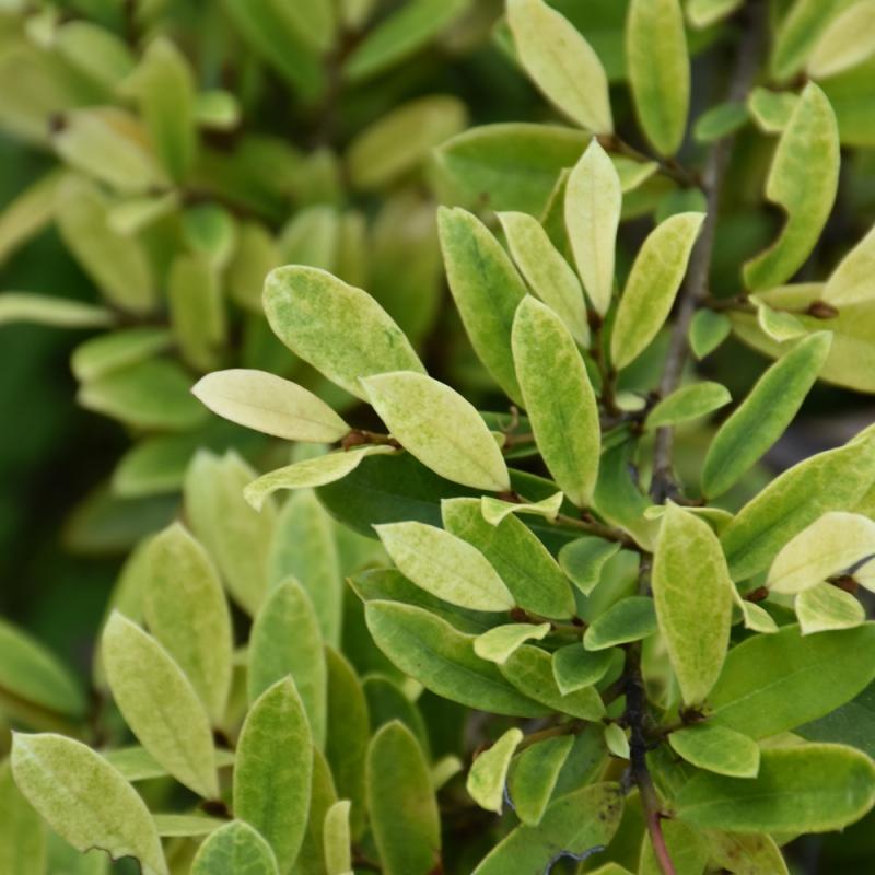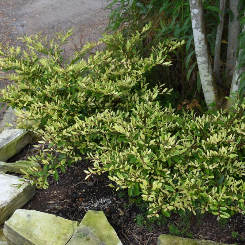 An attractive evergreen plant with emerging white foliage that matures slowly to deep green; in late winter to early spring, small reddish-maroon flowers emerge along the older branches; very elegant when massed together or as an accent shrub