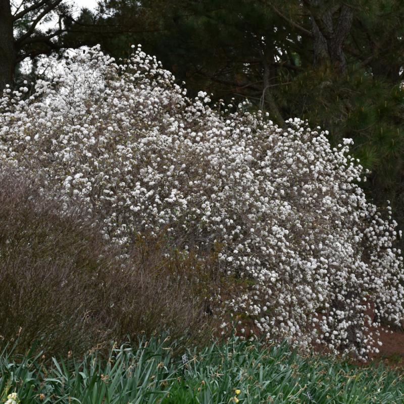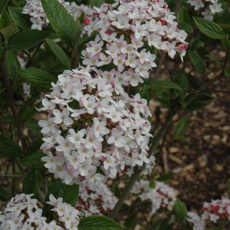 One of the finest garden shrubs, featuring showy red flower buds opening to intensely fragrant ball-shaped clusters of pink flowers in early spring, plant where the fragrance can be enjoyed, tidy the rest of the year; an ideal specimen or border shrub
