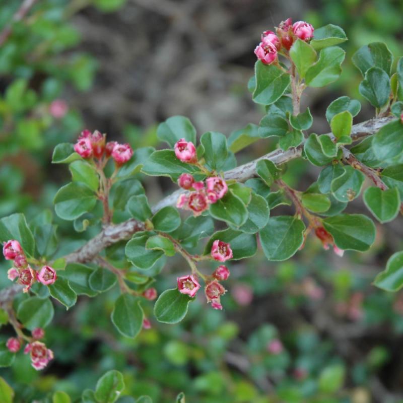 A very popular low growing groundcover, with a mounded spreading habit of growth; dense, tightly held branches; light pink flowers in spring along the branches, followed by striking red fruit in fall, one of the overall best groundcovers