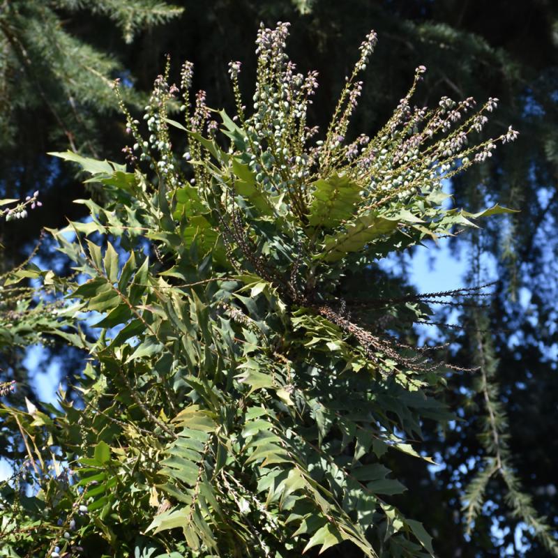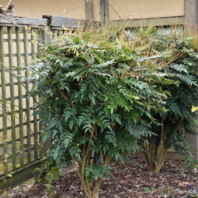Bold sprays of bright yellow flowers during winter and blue-black berries in summer and fall; a wonderful addition to the landscape; lustrous dark green foliage resembles the spiny leaves of a holly; plant it where it will receive some snow cover