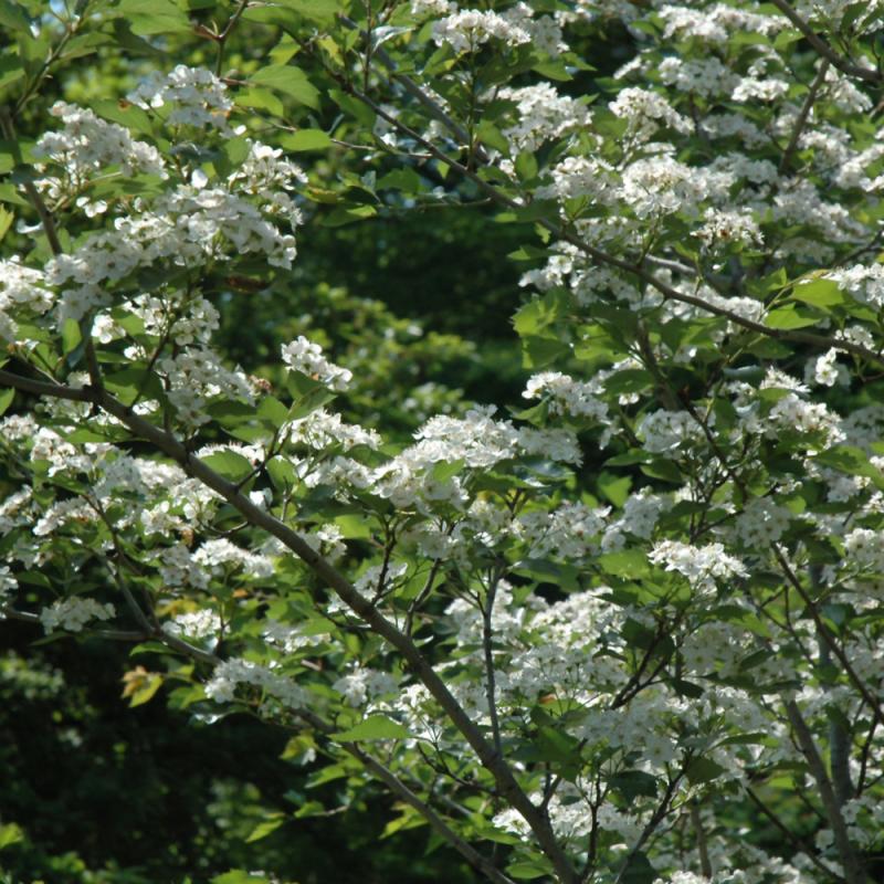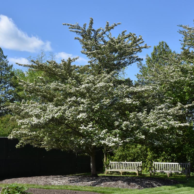 The new "in vogue" accent tree for home use, and with good reason; snowy white flowers in spring, an abundance of showy red fruit in fall, excellent fall color and a simply amazing criss-crossing branching habit; disease resistant, but very thorny