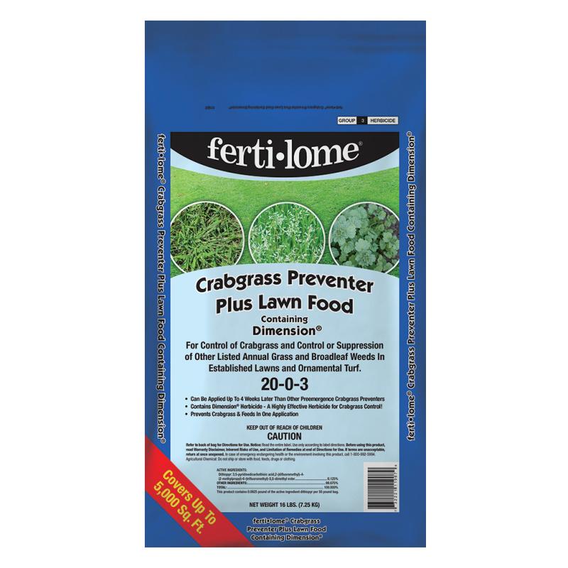 Crabgrass Preventer Plus Lawn Food containing Dimension ® 20-0-3 controls Crabgrass and controls or suppresses many other annual grass and broadleaf weeds in established lawns.