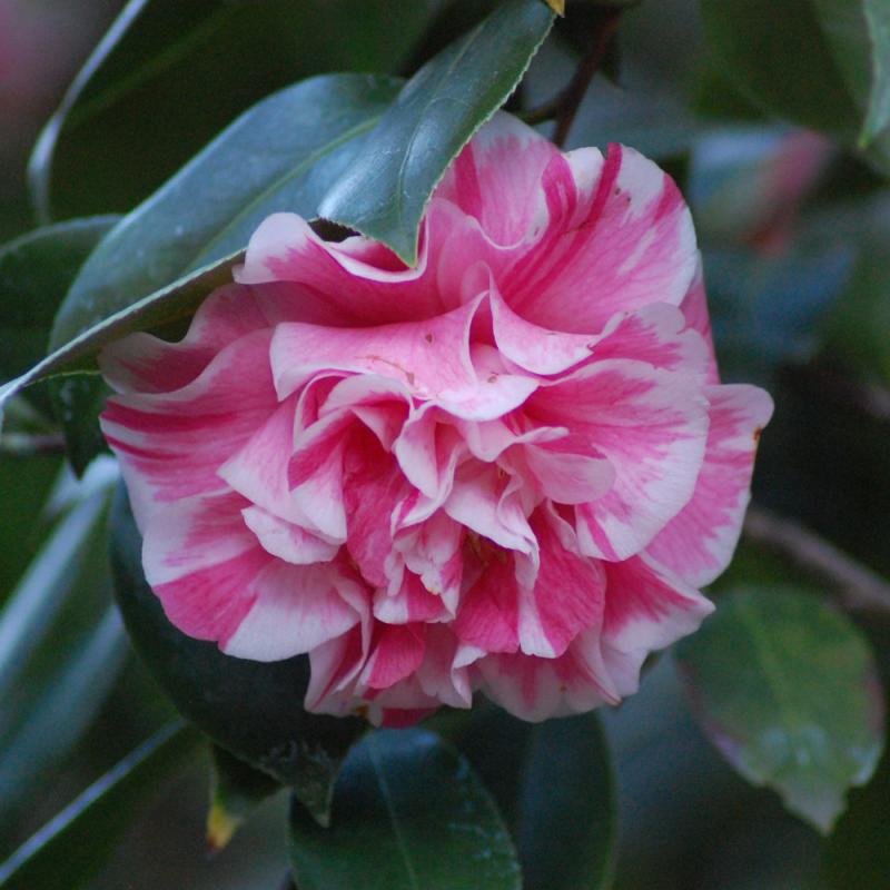 Floriferous, fragrant and fantastic double pink flowers edged with white and streaked with deep-pink; shiny, dark-green foliage is evergreen; provide rich, acidic, moist, well-drained soil