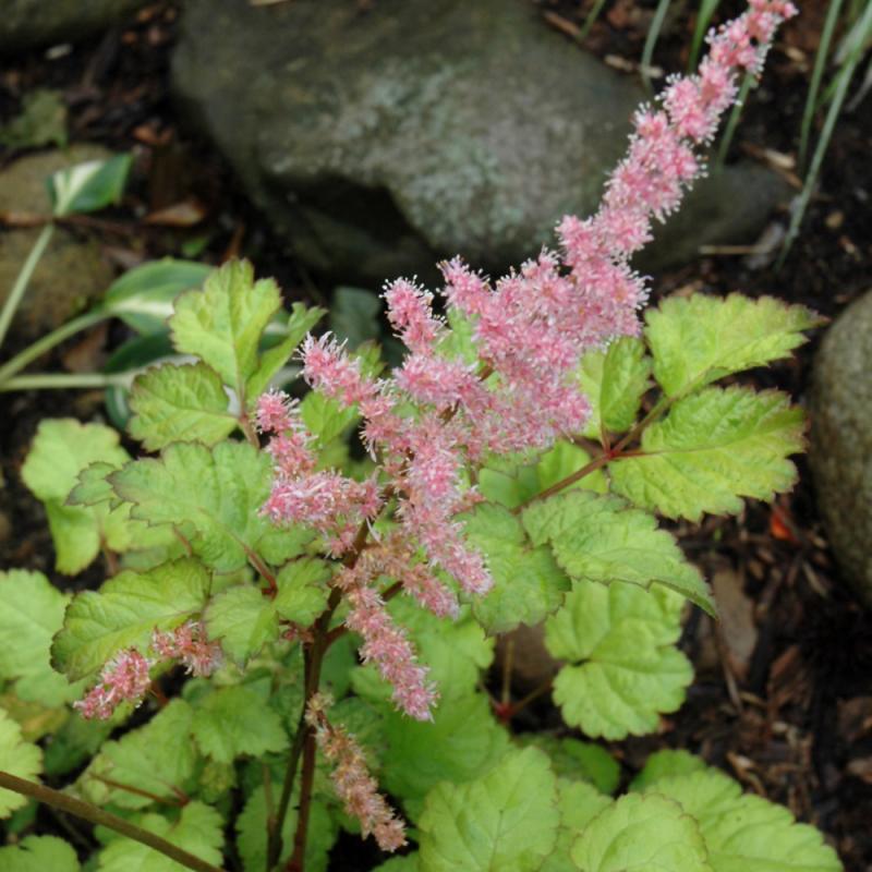 Soft, showy pink plumes, rising above bright golden-chartreuse leaves edged in red; perfect in a shady spot with dappled light; prefers moisture so water regularly for abundant flowers and nice foliage