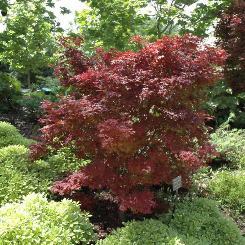 The lovely leaves of this compact variety remain burgundy-red throughout summer turning fiery scarlet-orange in fall, interesting branching habit; an ideal selection for gardens or containers