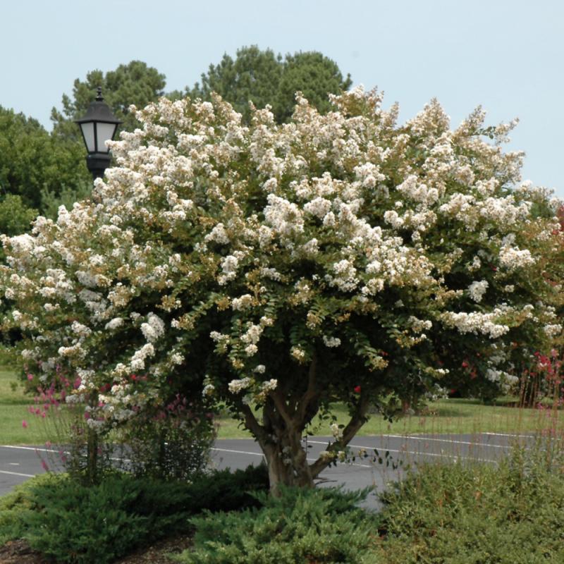 This variety is one of the first mildew resistant crapemyrtles with a semi-dwarf semi-pendulous habit; incredible pure white florets bloom luxuriously all summer long for a constant stunning display; may suffer from chlorosis in alkaline soils