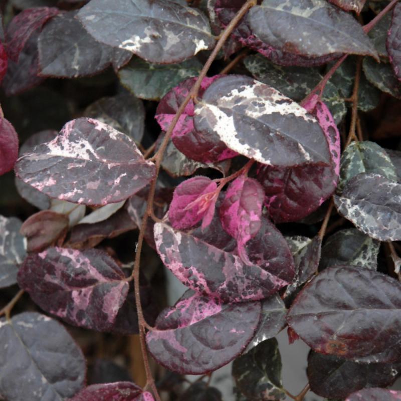 A spectacular, spring-blooming shrub with electric, deep pink strap-like flowers covering the plant in spring, dramatic deep maroon foliage is splashed with white and pink, providing a great show the rest of the season; easy to grow and maintain